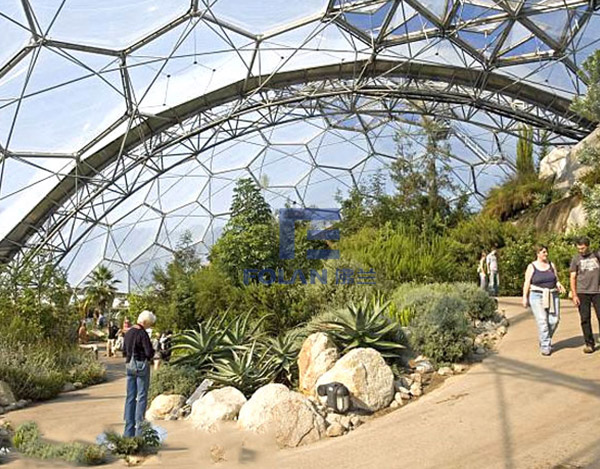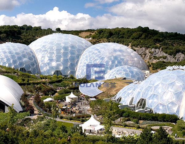 The world's largest botanical garden, to the inflated ETFE film structure. The whole building adopts single air pillow is fixed on the outside of the main steel structure, the hexagonal shape. Air pillow adopts three layer membrane structure, outer layer thickness of 250 microns, the inner film thickness is 200 microns, the middle thickness of 50 microns.