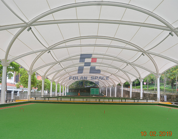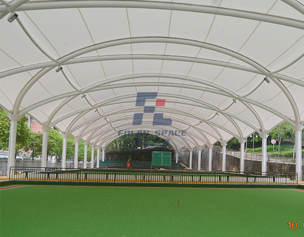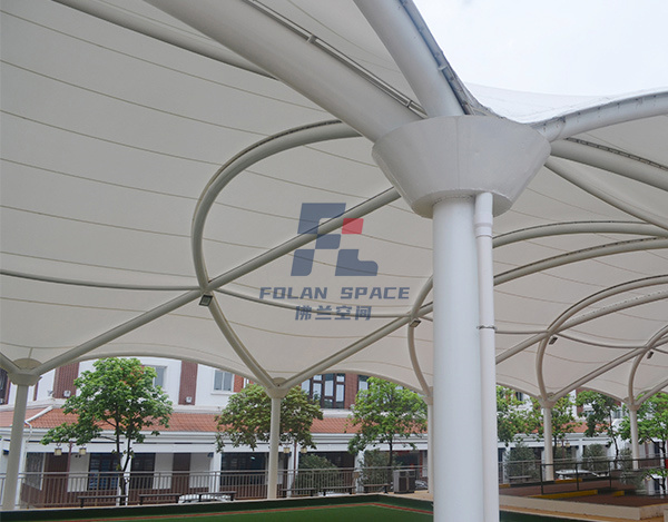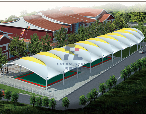 蓋頂材料選擇PVDF建筑膜材,這種材料具有透光、輕巧、抗風(fēng)、自潔、安裝快、無(wú)污染等特點(diǎn),建成后,不但可以遮陽(yáng)擋雨,與公園旁邊的綠樹相襯,又可成為一道新的風(fēng)景。