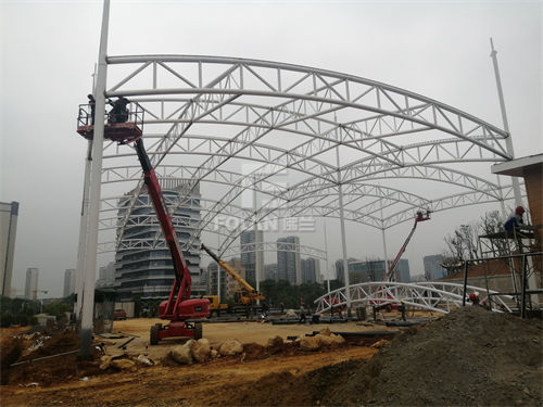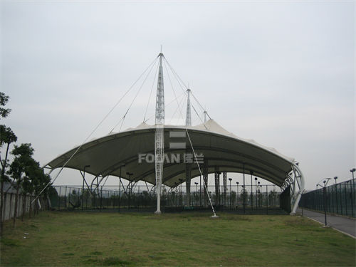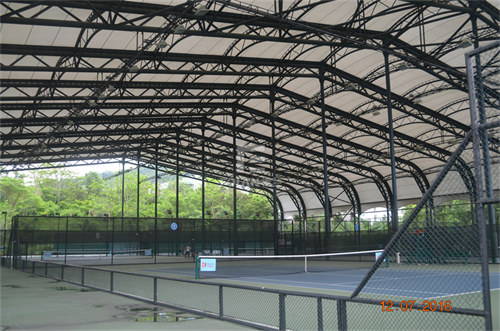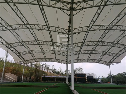 在與甲方洽談后,設(shè)計(jì)師決定采用骨架式膜結(jié)構(gòu)方案,是以鋼結(jié)構(gòu)為承重骨架、并在骨架上敷設(shè)膜材的結(jié)構(gòu)形式。膜選用的是材料優(yōu)質(zhì)、厚度適中、自潔性強(qiáng)、經(jīng)久耐用的白色膜,鋼結(jié)構(gòu)選用的是抗拉強(qiáng)度和屈服點(diǎn)高、耐腐蝕性高、沖擊韌性好、塑性好、耐久性好的鋼材。深圳市佛蘭空間膜結(jié)構(gòu)有限公司項(xiàng)目施工人員將膜材料敷設(shè)于鋼結(jié)構(gòu)上形成了一個(gè)大跨度、高度適中、寬敞明亮的風(fēng)雨門球場(chǎng)。安裝完工的膜結(jié)構(gòu)整體顏色與公園周邊景色十分協(xié)調(diào),它獨(dú)特的白色造型,為園區(qū)新添了一道靚麗風(fēng)景線,堪稱“省內(nèi)一流的膜結(jié)構(gòu)4連片風(fēng)雨門球場(chǎng)”。
