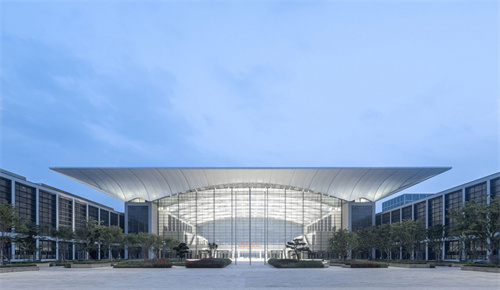 紅島國際會議展覽中心擁有14座展廳,建筑群亮點之一為入口大廳40米高的天然采光玻璃屋面,采用跨度高達93米的張拉膜結(jié)構(gòu),營造舒展起伏的獨特韻律。