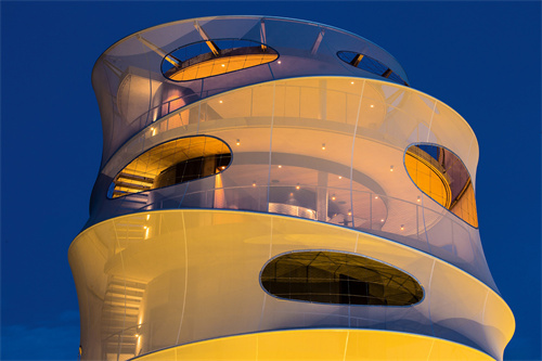 這座高23米造型獨(dú)特的餐廳足以吸引全島的目光。建筑使用鋼筋混凝土作為主要材料,金屬網(wǎng)和膜結(jié)構(gòu)作為建筑立面,垂直的桶狀構(gòu)造既是它的支撐結(jié)構(gòu)也是建筑的主體,外圍使用預(yù)制樓板制成的主樓梯盤(pán)旋而上。