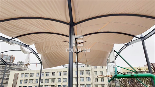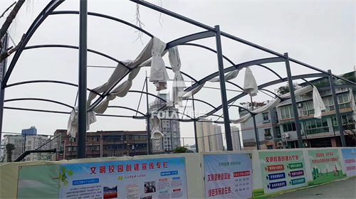 該學校風雨操場位于四川省內江市,佛蘭空間負責該球場鋼結構的制作、加工、安裝和膜材的制作、加工、安裝。項目人員進場后,辛苦施工,不足月余,該項目順利竣工。