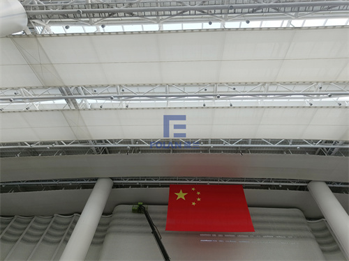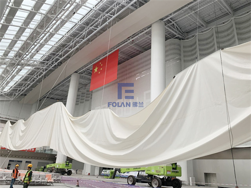 PTFE軟膜,它透光性好,強度高,吸音效果好,A級防火材料,安全又環(huán)保。目前佛蘭空間已完成該項目的2塊膜材吊頂,項目施工人員仍在日夜不停的施工中。