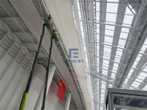 虎門高鐵站PTFE軟膜吊頂工程,膜安裝面積約7000多平方米,施工方式采用多條長型PTFE軟膜逐步安裝,其中最長的一條約100米,如此長跨度的軟膜吊裝也成為了此工程的一項難點。佛蘭空間項目施工人員不畏困難,在卷揚機和高空車的輔助下,齊心協力完成了100米長的內膜吊裝及固定。