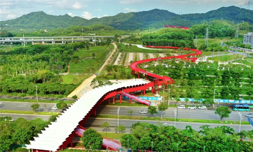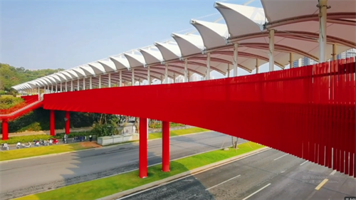 若你們想去深圳旅游,一定要去深圳最美“紅飄帶”——光明虹橋公園。其中“虹橋”全長4公里,是全國第二大鋼結(jié)構(gòu)單柱多曲景觀橋。入口處,設(shè)有一段造型獨特的白色PTFE膜結(jié)構(gòu),飄逸又壯美!