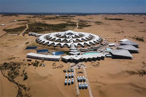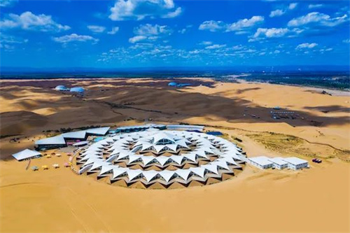 在一片茫茫沙海中,目光所及的只有藍(lán)天,白云,沙漠,以及蓮花狀的響沙灣酒店,設(shè)計充分融合沙漠文化,給人感官上的新鮮感,建筑結(jié)構(gòu)及膜材的運用充滿未來感和科技感。