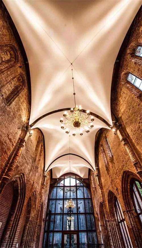 除了外部及屋頂,教堂內(nèi)部吊頂也會運用膜結(jié)構(gòu)。膜材吊頂,既能吸音,又能起到裝飾作用,營造出舒適、溫馨、神圣的空間環(huán)境。
