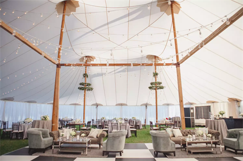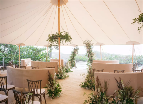 它搭建地點靈活,可選擇海邊,也可選擇平坦的草坪。此外,婚禮篷房的布置操控性也更大,婚禮篷房頂部可選用不同的膜材,有純白色的,也可以是紅色和其他您喜歡的顏色。另外,膜結(jié)構(gòu)婚禮篷房可搭配其他裝飾實現(xiàn)歐式、田園,中式等各種主題婚禮,靈活多變。