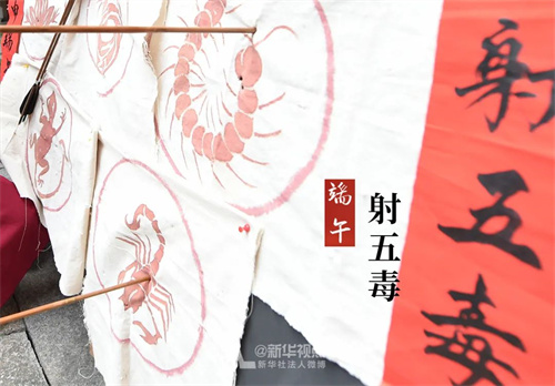 民間流傳,五月初五是毒月毒日,是蛇、壁虎、蝎子、蜈蚣、蟾蜍五毒出沒(méi)的日子。古時(shí)候,鄉(xiāng)里壯勇之士皆持弓箭赴本土保境廟宇加持祈福,祈求能以弓箭將本鄉(xiāng)本土境內(nèi)荼毒生靈的各類毒物驅(qū)逐殆盡。所謂“射五毒”,就是通過(guò)射五毒草靶來(lái)比賽射藝。