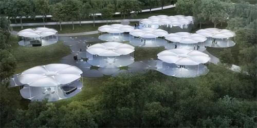 牽?;ㄔ煨陀陚隳そY(jié)構(gòu)建筑是一種低成本模塊化產(chǎn)品,可以在任何需要庇護(hù)的地方出現(xiàn)。這些獨(dú)立結(jié)構(gòu)的花瓣無論是單獨(dú)還是概括起來,都為下面的活動和參與者提供了屋頂和空間組織。