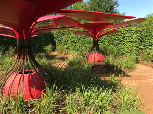 在去年舉辦的第30屆盧瓦爾河畔肖蒙國際花園節(jié)中,展示了很多新品花卉及創(chuàng)新展示方案,其中這個紅色花形景觀膜最具象征意義,它能啟發(fā)人們更多參與良性生態(tài)循環(huán),并警醒人們對水資源的價值認(rèn)識。