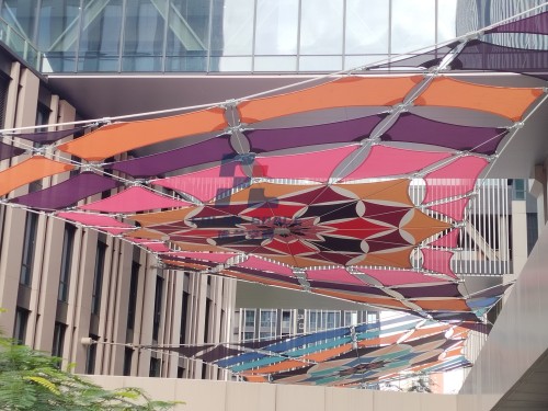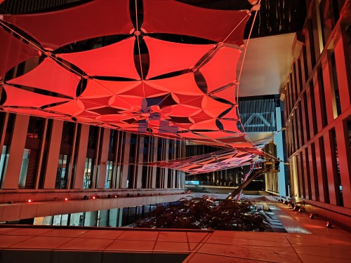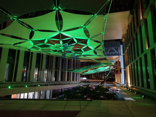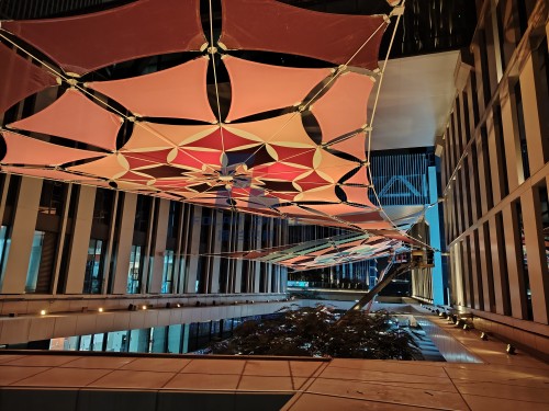 每一片“花瓣”都貼合結(jié)構(gòu)力學(xué)的精準(zhǔn)設(shè)計(jì),膜材的柔韌勾勒出花瓣的自然弧度;夜幕降臨時(shí),LED偏光染色燈通過控制系統(tǒng)實(shí)現(xiàn)色彩漸變,紫、粉、黃、藍(lán)、紅的光線穿透膜面,似繁花綴光、靈動(dòng)生長,既有建筑的嚴(yán)謹(jǐn)質(zhì)感,又有自然的柔美肌理。