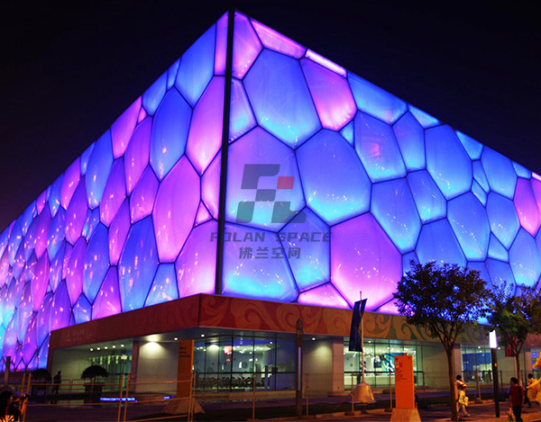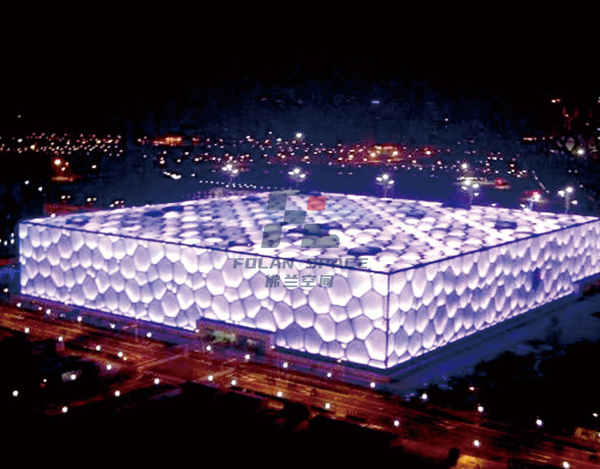 世界上最大的ETFE充氣膜結(jié)構(gòu)建筑,主體鋼構(gòu)采用兩種規(guī)格的多面體(14面體和12面體)組合成的多空間多面體陣列實(shí)體。建筑屋面和墻體有3615個(gè)氣枕覆蓋,大跨度10.75m,大氣枕面積約70㎡,小面積則不足0.5㎡。