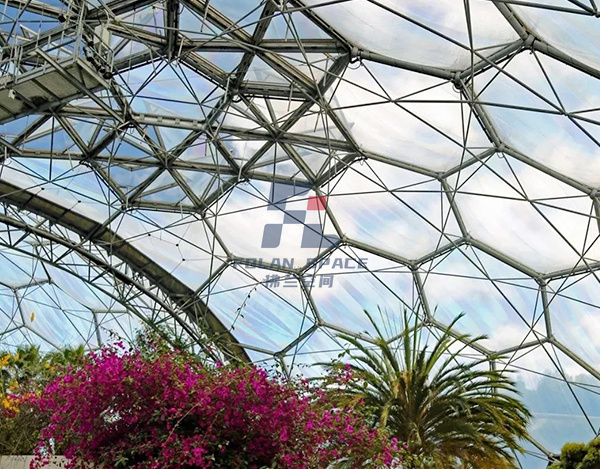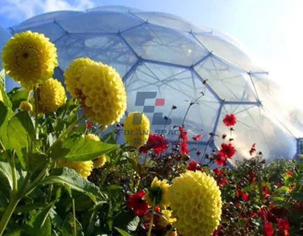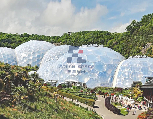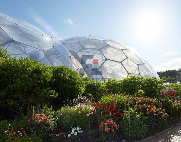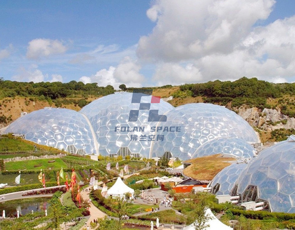 目前世界上大的植物園,為ETFE充氣膜結(jié)構(gòu)。整個(gè)建筑采用單層氣枕固定在主體鋼構(gòu)外側(cè),形狀多為六邊形。氣枕采用三層膜結(jié)構(gòu),外層厚度250μm,內(nèi)層膜厚度為200μm,中間厚度為50μm。