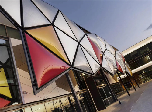 新的OranPark圖書館外立面,由31個(gè)三角形氣枕組成,氣枕設(shè)計(jì)成四種顏色:紅色,黃色,白色以及透明鍍點(diǎn),以此滿足不同部位室內(nèi)環(huán)境對(duì)陽光的需求。背面均采用透明ETFE膜,此外還增加了LED照明系統(tǒng),為夜間增加不同的視覺效果。