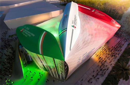 迪拜世博會(huì)意大利館的屋頂由一系列不同形狀和尺寸的ETFE氣枕組成,覆蓋面積約為1600平方米。膜結(jié)構(gòu)氣枕形成了一個(gè)蜿蜒的表面,就像大海和沙漠的波浪一樣。設(shè)計(jì)采用了桔皮、咖啡渣、菌絲體和從海洋中提取的再生塑料等材料作為建筑元素,以此展現(xiàn)建筑的可持續(xù)性和環(huán)保原則。