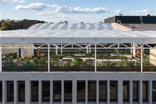 ETFE屋頂覆蓋了兩座建筑的頂層屋頂花園,并在藝術(shù)區(qū)建筑的中間形成了一個(gè)內(nèi)部中庭,將麥考瑞大學(xué)藝術(shù)區(qū)大樓連接在一起。