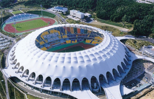 釜山亞運(yùn)會(huì)主競(jìng)技場(chǎng)是一個(gè)標(biāo)準(zhǔn)的圓頂建筑,直徑約為228米,由48根人形斜柱和垂直混凝土柱組成,屋頂鋼索與其他下部支撐的鋼筋混泥土柱相對(duì)應(yīng),分成48個(gè)部分,索桁架由環(huán)頂索、徑向索、垂直索和立柱組成。