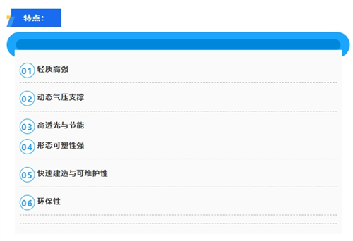 應用場景:體育與文化活動場館、交通樞紐、購物中心中庭、動植物溫室、潔凈廠房與污水池覆蓋、野戰(zhàn)醫(yī)院、展覽篷房、城市藝術景觀裝置。