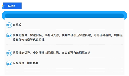 應用場景:體育場館、展覽中心環(huán)保煤棚、冷鏈物流、應急醫(yī)療帳篷、救災臨時住房、充氣拱門、廣告裝置等商業(yè)景觀。
