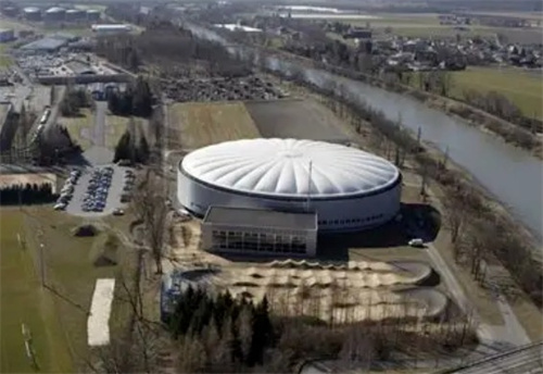 該競(jìng)技場(chǎng)平面為橢圓形氣囊膜,尺寸為90.8m×66.83m,面積5000㎡,由28根柱支撐。上下28根徑向索連接中心直徑5m的圓與周圍支承柱,對(duì)氣囊膜加勁和穩(wěn)定,整體形似自行車轂轆。在周邊三角形桁架內(nèi)為兩環(huán)正方寶石形整體張拉單元,下部徑向索與垂直壓桿端連接,上端連接穩(wěn)定索,并為氣囊膜下層支點(diǎn)。