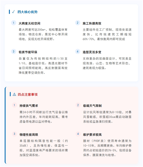 氣承式膜結(jié)構(gòu)以其獨(dú)特的輕盈、靈活和大跨度優(yōu)勢(shì),在現(xiàn)代建筑中占據(jù)重要地位。盡管存在一定局限性,但隨著材料科學(xué)與工程技術(shù)的進(jìn)步,其應(yīng)用前景仍然廣闊,未來或?qū)⒃诳沙掷m(xù)建筑和臨時(shí)設(shè)施領(lǐng)域發(fā)揮更大作用。
