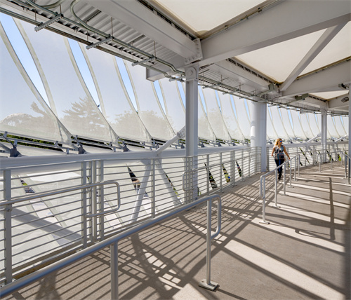 這種輕質(zhì)膜結(jié)構(gòu)與看臺(tái)樓梯的巧妙結(jié)合,引導(dǎo)觀眾在半透明的頂篷下自由移動(dòng),并能欣賞到校園和公園的壯麗景色,將體育競賽與休閑觀景完美結(jié)合,營造出輕松獨(dú)特的網(wǎng)球體驗(yàn)。