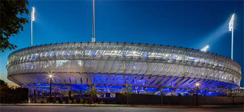 PTFE材料的半透明特性,創(chuàng)造出獨(dú)特的視覺對(duì)話。場外的人可以瞥見場內(nèi)活動(dòng)的模糊光影,激發(fā)了好奇心與參與感;場內(nèi)觀眾則能透過表皮看到公園的綠意,緩解了大型建筑的封閉感。