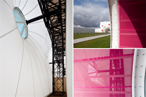 白色的膜外皮上面點(diǎn)綴著彩色的開口,這些開口是節(jié)點(diǎn),也可以消解風(fēng)壓,并為場(chǎng)地通風(fēng),也有的充當(dāng)著場(chǎng)地的出口。