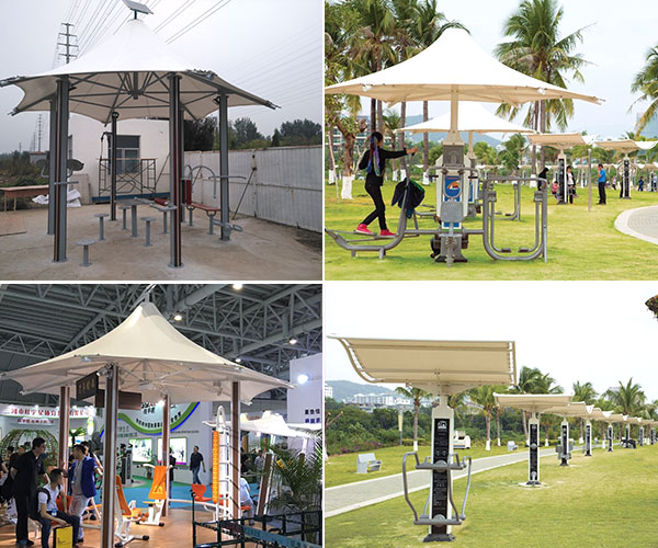 為打造戶外小型健身房,將單一功能的健身器材安裝在一個膜結構亭子內,形式獨特,新穎,讓人眼前一亮,真正作到了與大自然融為一體,體育配套膜結構亭子既發(fā)揮了健身器材強身健體的本意又起到了檔雨遮陽的作用。