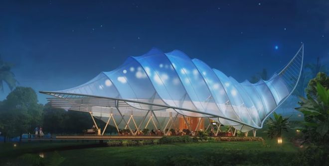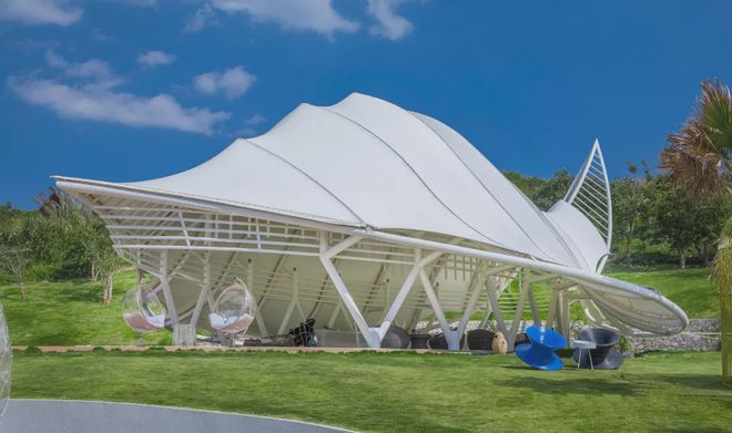 可見(jiàn)澤棲帳篷酒店,所有建筑都采用了張拉膜結(jié)構(gòu),完美地體現(xiàn)了建筑的獨(dú)特意象。