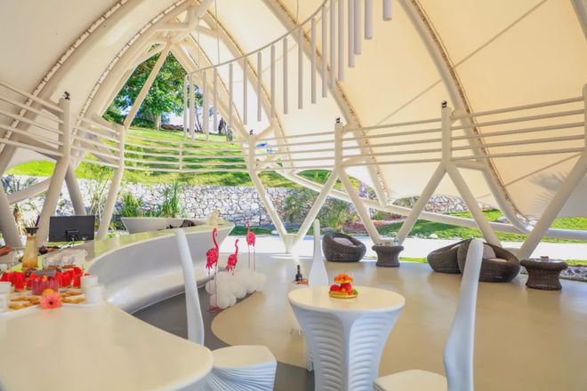 設(shè)計(jì)首創(chuàng)仿生帳篷建筑語(yǔ)匯,造型上融入多種仿生小動(dòng)物設(shè)計(jì),在如此靈動(dòng)童話般的環(huán)境空間中,客人的身體也仿佛幻化為,比蝶更輕盈,比蜂更自由的靈性存在。