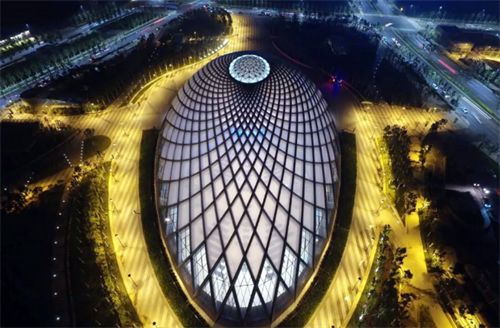 其復(fù)雜優(yōu)美的網(wǎng)格形式在國內(nèi)大跨度鋼結(jié)構(gòu)領(lǐng)域?qū)儆谑讋?chuàng),同時,將支座設(shè)計(jì)成雙球鉸鋼支座,也是國內(nèi)網(wǎng)殼結(jié)構(gòu)的首例。