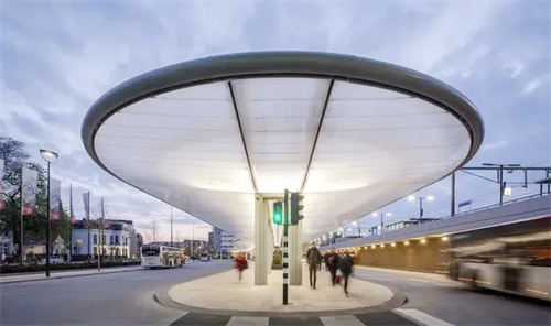 耐用、輕便且耐候的材料使設(shè)計(jì)師能夠?qū)⒔Y(jié)構(gòu)塑造成引人注目的球形。建筑師選擇在中間打開結(jié)構(gòu)以提供額外的日光,創(chuàng)造一個令人愉悅的環(huán)境,旅客可以在等待公共汽車時聚集在一起交談。