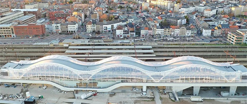 巨大的透明外墻排列在火車站建筑的外部,可讓大量的自然光線進(jìn)入覆蓋火車軌道的大廳。4米跨度的網(wǎng)格容納了超輕的ETFE氣枕。氣枕的弧形表面完美地符合了“波浪”的設(shè)計(jì)意圖。此外,屋頂還安裝了定制形狀的ETFE氣枕,通勤者在享受充足陽光的同時,還能躲避狂風(fēng)暴雨。