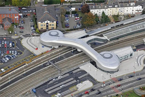 兩個位于鐵路兩側(cè)的圓頂建筑通過橫跨鐵路的天橋連接起來,材料是ETFE和鋁飄帶。螺旋狀的通道將乘客引入其中。設(shè)計(jì)通過忽略場地的方式對周圍環(huán)境和建筑做出回應(yīng)。其圓潤的形體模糊了屋頂和墻面、橋梁與建筑的范圍,乘客將在這里感受到一種獨(dú)特的異構(gòu)空間。