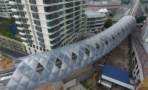 Kelana Jaya LRT Line Tunnel被譽(yù)為吉隆坡第一條“空中隧道”,于2016年3月開通,由ETFE氣枕包覆到扭曲的鋼結(jié)構(gòu)格子構(gòu)成,2500平方米的ETFE氣枕,由建筑師設(shè)計(jì)以創(chuàng)造一個“破碎”的表面,氣枕是透明,并印有厚重的銀色印刷,以在整個覆層上產(chǎn)生圖案。