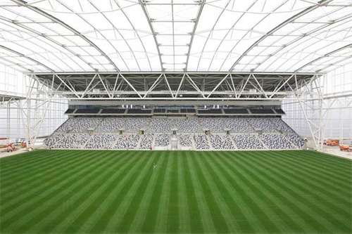 美國(guó)銀行體育場(chǎng)使用了240,000平方英尺的透明ETFE屋頂,這是美國(guó)最大的屋頂。在這個(gè)體育場(chǎng)中,ETFE發(fā)揮了許多優(yōu)勢(shì),它的透明性使建筑內(nèi)的視野更清晰,還支持運(yùn)動(dòng)員們沐浴在自然光線下比賽。另外,該ETFE膜結(jié)構(gòu)可伸縮屋頂可在幾分鐘內(nèi)打開,為觀眾帶來(lái)全新的體驗(yàn)。