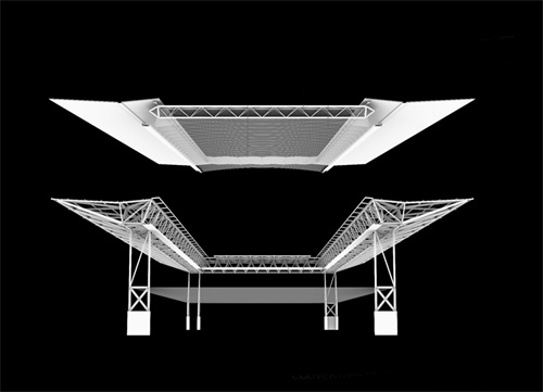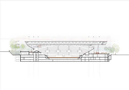 設(shè)計(jì)方案覆蓋現(xiàn)有看臺(tái),并向兩側(cè)懸挑。折疊開合式屋頂一部分由高密度建筑膜材構(gòu)成,其固定部分的結(jié)構(gòu)構(gòu)件則提供展開和移動(dòng)所需的支撐。所有構(gòu)件的設(shè)計(jì)均出于力學(xué)考慮,并不作為裝飾使用。