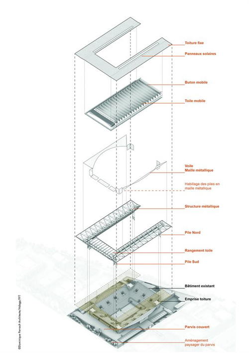 屋頂折疊開合部分,由21塊V形建筑膜材模塊組成,固定在懸索纜繩間。每個(gè)模塊大約5米寬、44米長(zhǎng),總覆蓋表面積約4800平方米。當(dāng)屋頂展開時(shí),懸索結(jié)構(gòu)拉緊以承受風(fēng)力和雨的荷載,建筑膜材模塊沿軌道由南向北伸展。北側(cè)設(shè)有非固定式構(gòu)件梁架,用于在移動(dòng)和折疊期間提供有效的推動(dòng)力。