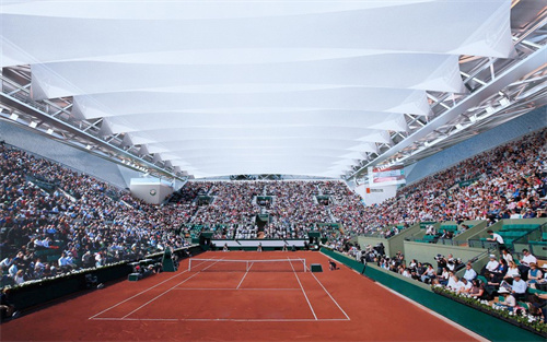 屋頂薄膜融合了羅蘭·加洛斯網(wǎng)球公園的紅土色調(diào)、電子顯示屏的綠色基調(diào)以及露天看臺(tái)清水混凝土的灰色基調(diào),伴隨不同時(shí)段光線的變化,展現(xiàn)其色彩的柔和多樣性。