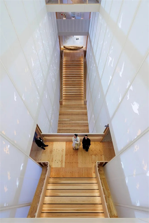 前立面半透明薄膜不僅塑造“帆”的視覺(jué)符號(hào),還通過(guò)疏水與透光特性實(shí)現(xiàn)被動(dòng)式氣候調(diào)節(jié),減少空調(diào)能耗。膜材與木材的對(duì)比設(shè)計(jì),象征傳統(tǒng)工藝與現(xiàn)代技術(shù)的對(duì)話,同時(shí)提升建筑的通透性與輕量化。