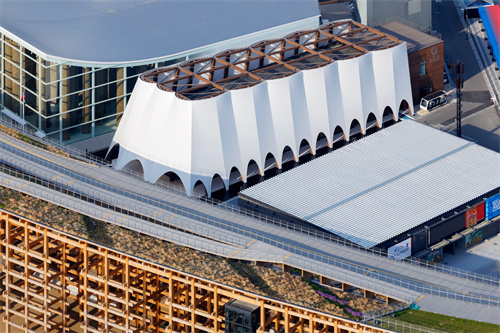 卡塔爾館,由隈研吾建筑都市設(shè)計(jì)事務(wù)所與卡塔爾博物館合作設(shè)計(jì),造型宛如一艘傳統(tǒng)的單桅三角帆船(dhow),這種帆船曾是阿拉伯灣貿(mào)易和采珠業(yè)的重要工具。展館的白色弧形頂篷懸掛在精巧連接的木框架上,既像迎風(fēng)招展的船帆,又像日本和卡塔爾木工工藝中那種富有張力的寧?kù)o。